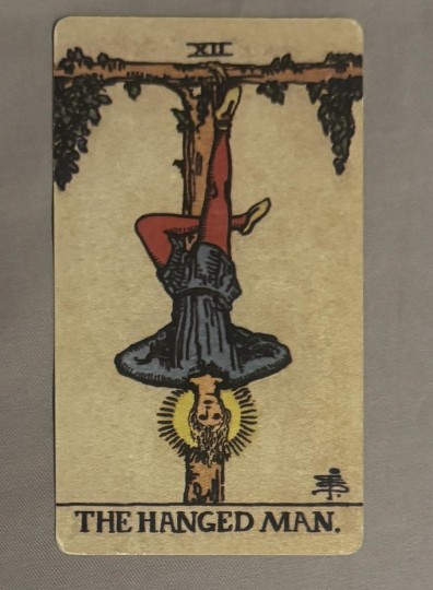 在占卜上,吊人主要有牺牲的意义。他并不是被强迫的,而是出于自愿。仔细看他的表情,如此宁静安详,还有他头上的智慧光环,显示他在精神上的理解已经超越常人。他不挣扎,也不想挣扎,因为他明白,随牺牲而来的将是更有价值的收获。以不变应万变,不采取任何行动,才是吊人的作风。