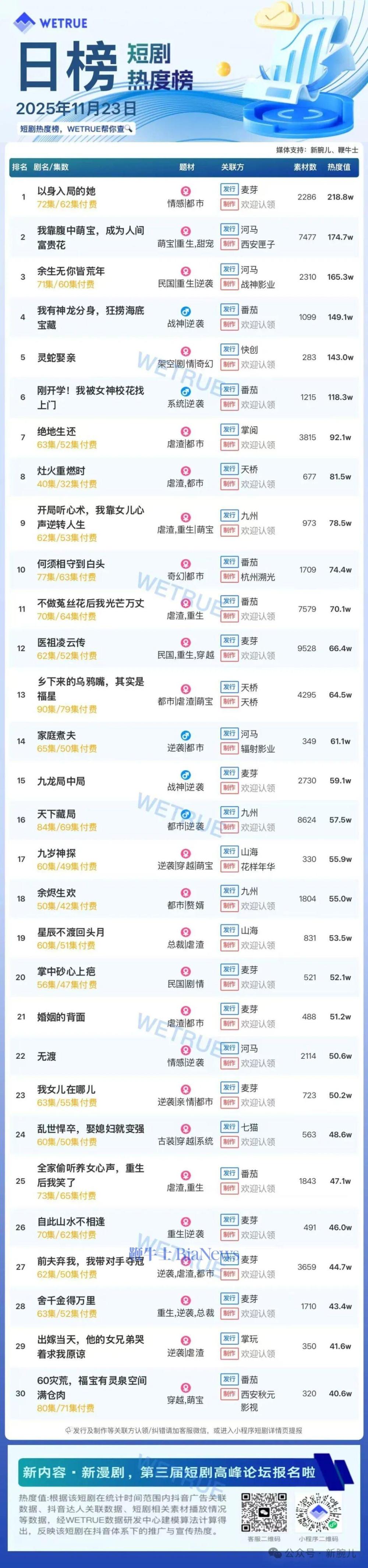 1、本日榜为WETRUE短剧数据公司提供,新腕儿和鞭牛士提供联合支持。